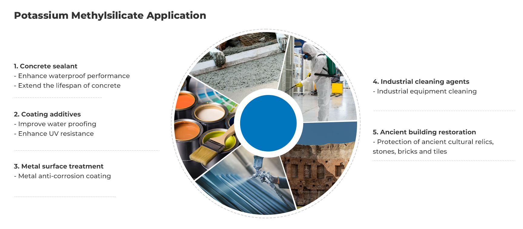 Conas a dhéanann Sileacáit Meitil Potaisiam iarratas leathan a bhaint amach i réimse an uiscedhíonta ábhar tógála lena n-airíonna uathúla?