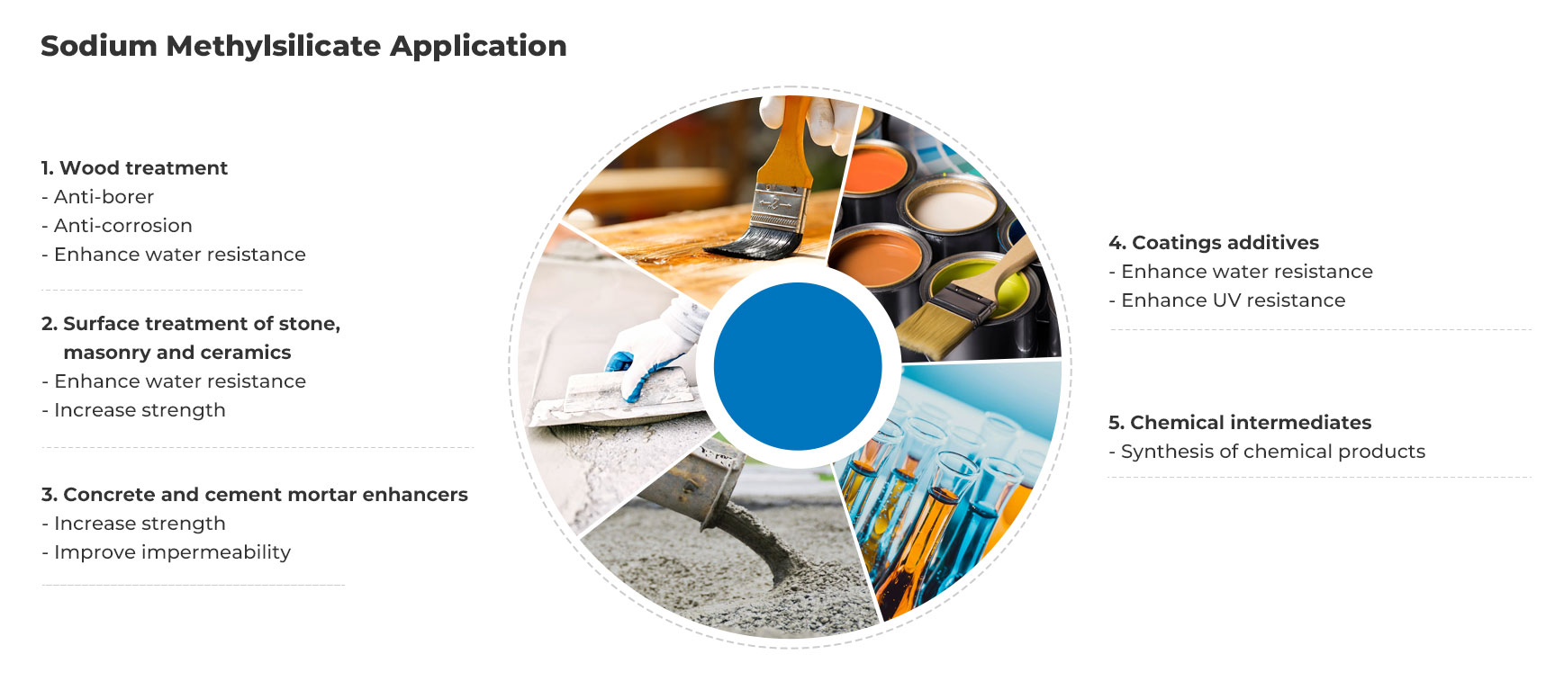 Leis na hairíonna den scoth seo, tá ionchais iarratais leathan ag sileacáit meitile sóidiam i go leor réimsí. I réimse na tógála, is féidir é a úsáid le haghaidh uiscedhíonta na ballaí seachtracha, díonta, íoslaigh agus páirteanna eile d'fhoirgnimh, a chosc go héifeachtach sceitheadh uisce báistí agus an struchtúr tógála a chosaint. Ag tógáil foirgneamh cónaithe ard-ardú mar shampla, tar éis sileacáit meitile sóidiam a úsáid le haghaidh uiscedhíonta na mballaí taobh amuigh, tar éis blianta de bháisteach trom, ní raibh aon sceitheadh ar an mballa, agus thit ráta gearán na gcónaitheoirí go suntasach. In athchóiriú na sean-limistéar cónaithe, baineadh úsáid as sileacáit meitile sóidiam chun an díon a uiscedhíonta, rud a chuir go mór le saol seirbhíse an dín.
